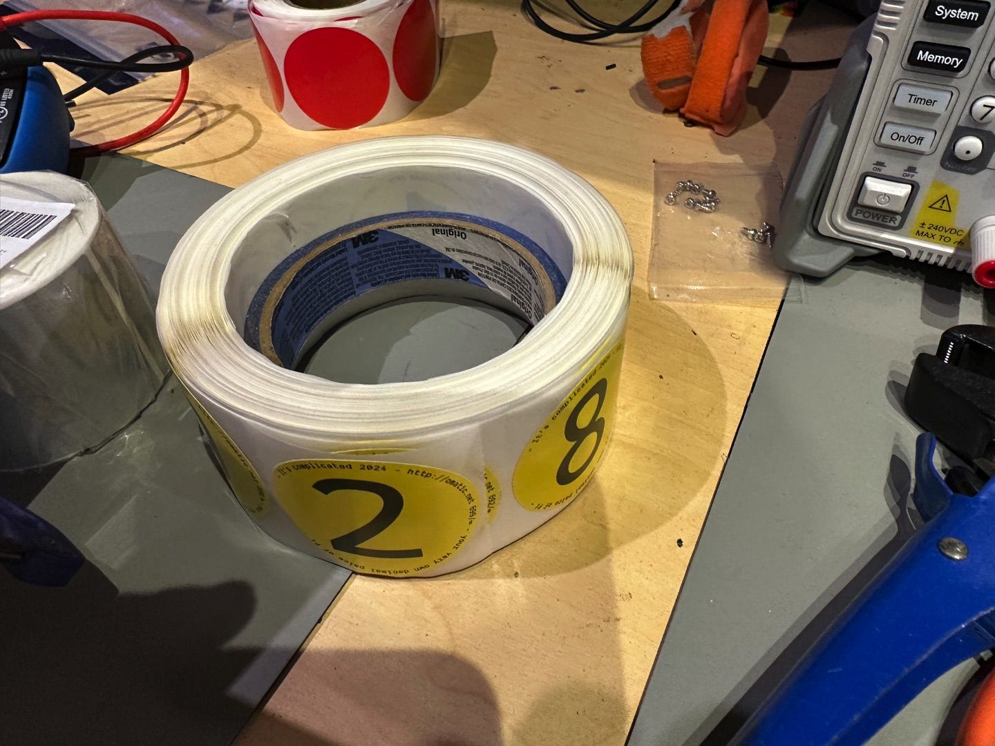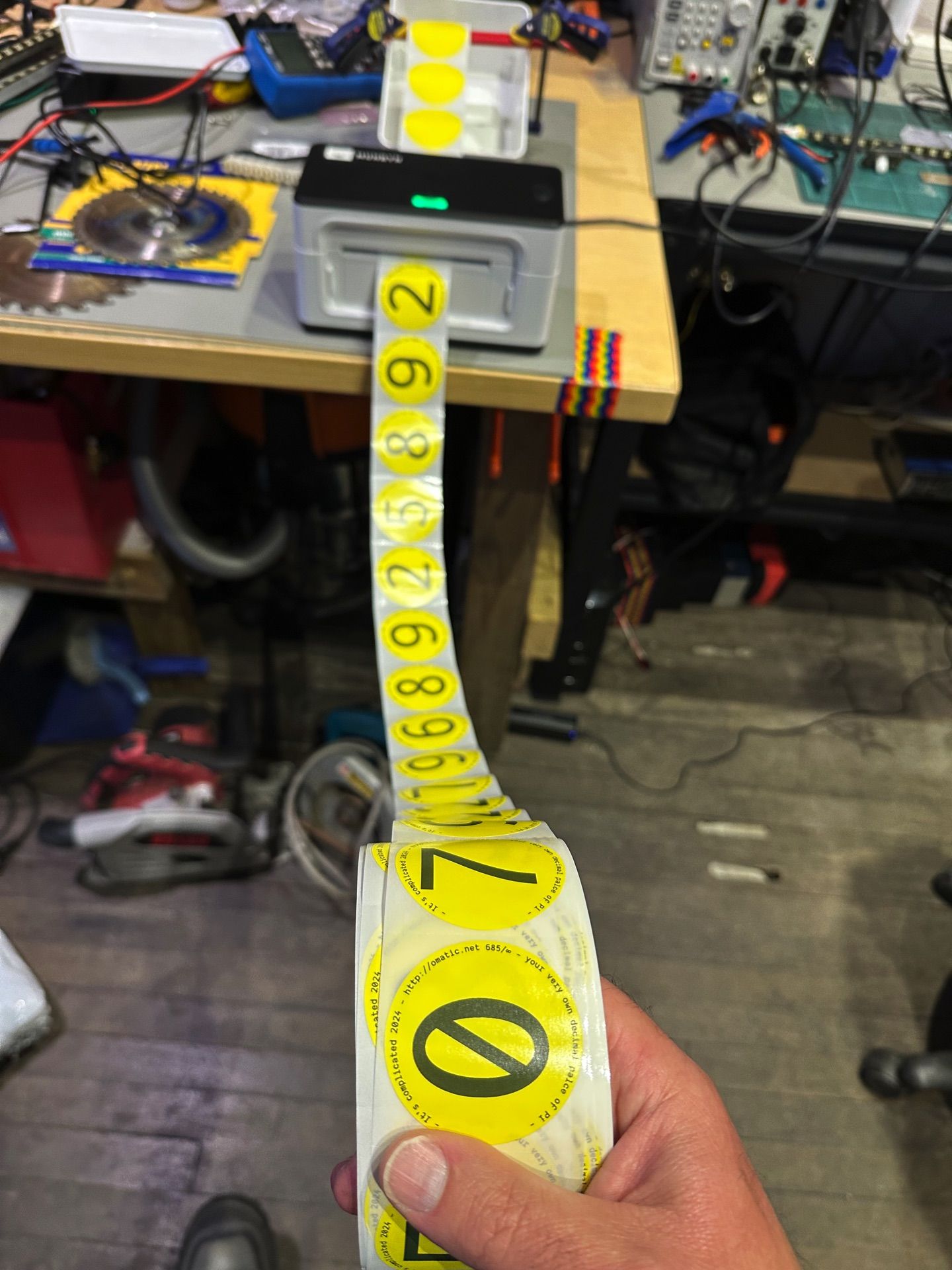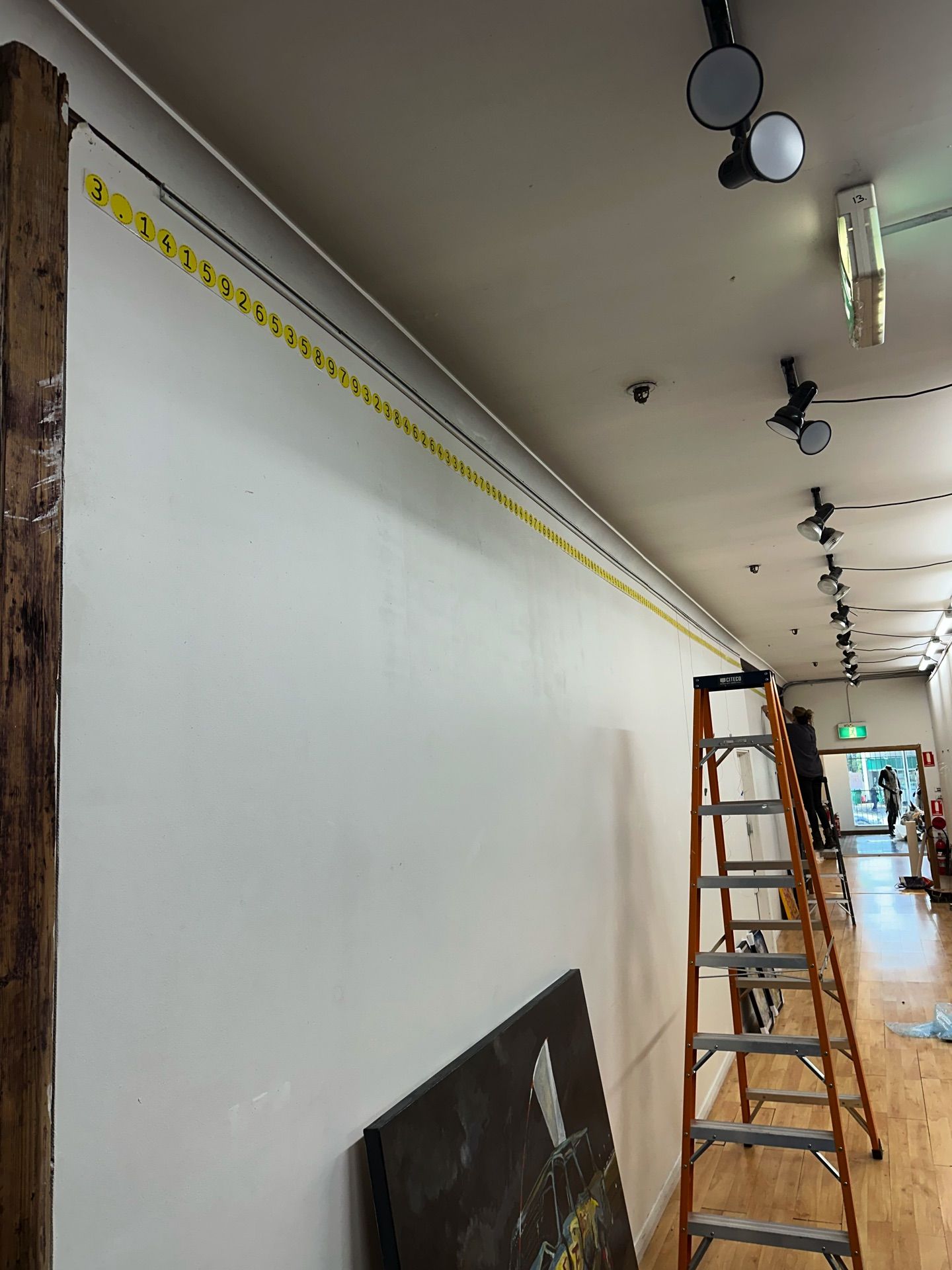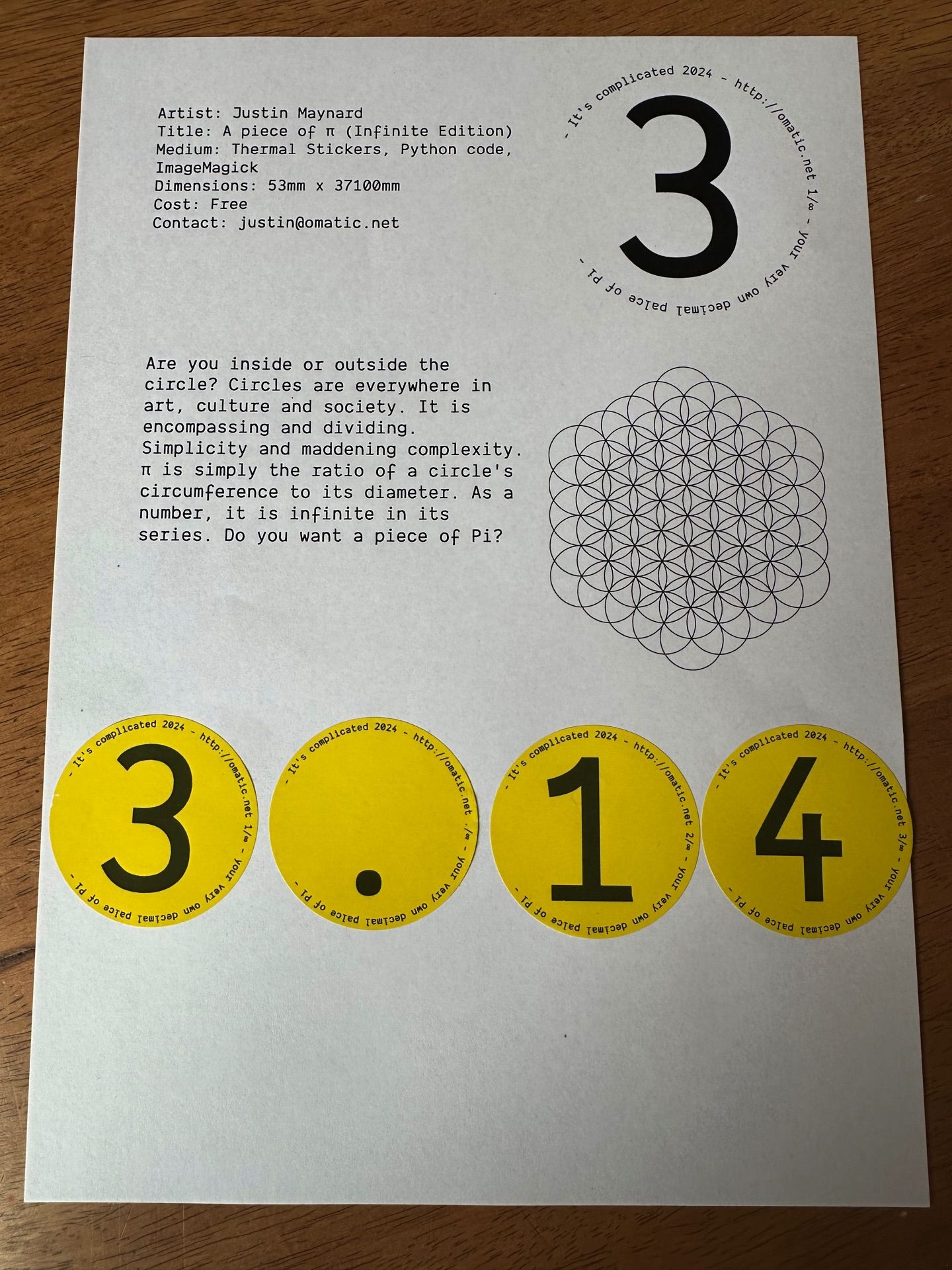 A piece of π (Infinite Edition) is a bit of fun geek art for a Tortuga Studios group show called It's Complicated. It's a very literal interpretation of the brief. I had the idea to do pi to a large number of decimal places around the gallery, then realised that I could do it with our new thermal printer on a whole roll of circle stickers. Prefect. Let's make it so. The plan is to dismantle the art during the show and give away the stickers so everyone can take home a piece of π.