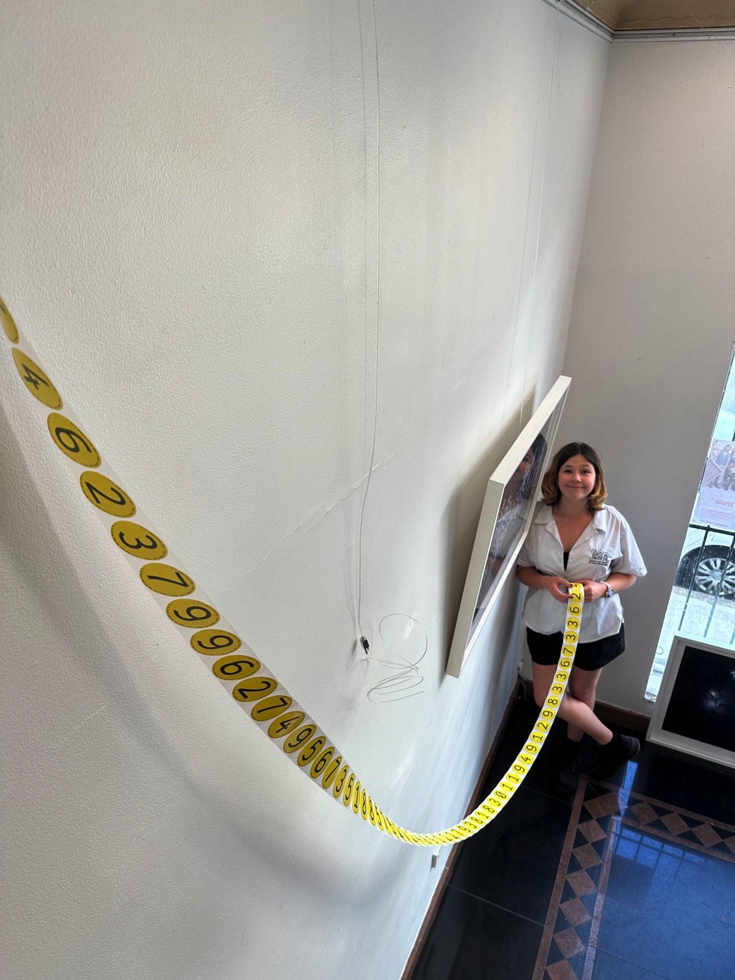 a person holding a piece of tape with the word zero a bucket of paint sitting on a table a woman is measuring a wall with tape a white wall with a ladder and a painting on it a wall with a picture hanging on it a piece of paper with a number on it